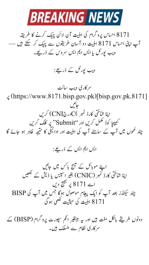 | Eligibility Check | CNIC via 8171 SMS or Web Portal |