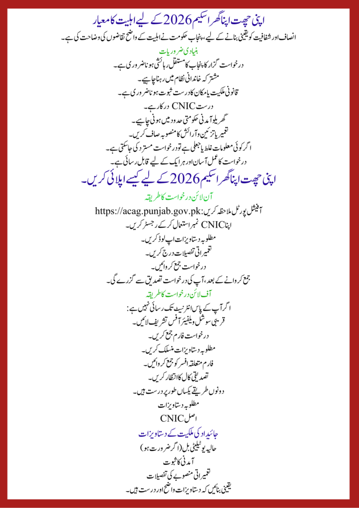 The Apni Chhat Apna Ghar Scheme 2026 is a strong and practical step by the Government of Punjab to support joint families struggling with housing problems. By offering interest-free loans, flexible repayment plans, and a transparent application process, this program gives families a real opportunity to improve their homes without financial stress.
