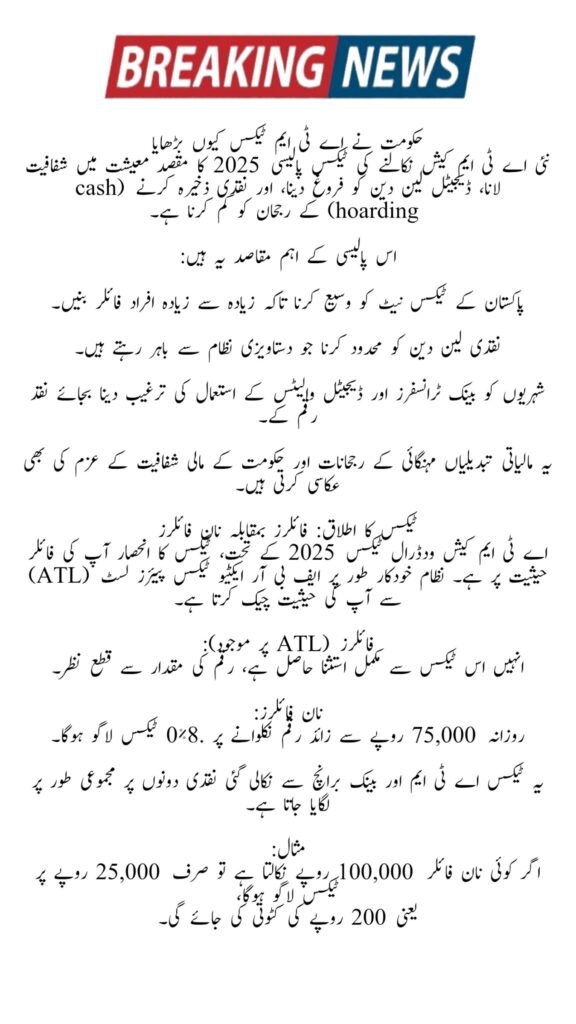 The Government of Pakistan has officially revised the ATM Cash Withdrawal Tax 2025, increasing the rate and threshold for non-filers under the Finance Act 2025. This new rule directly impacts cash withdrawals made through ATMs and bank counters across the country.The updated system aims to encourage tax compliance, reduce untracked cash circulation, and push more citizens to become Active Taxpayers (filers) under the FBR system.