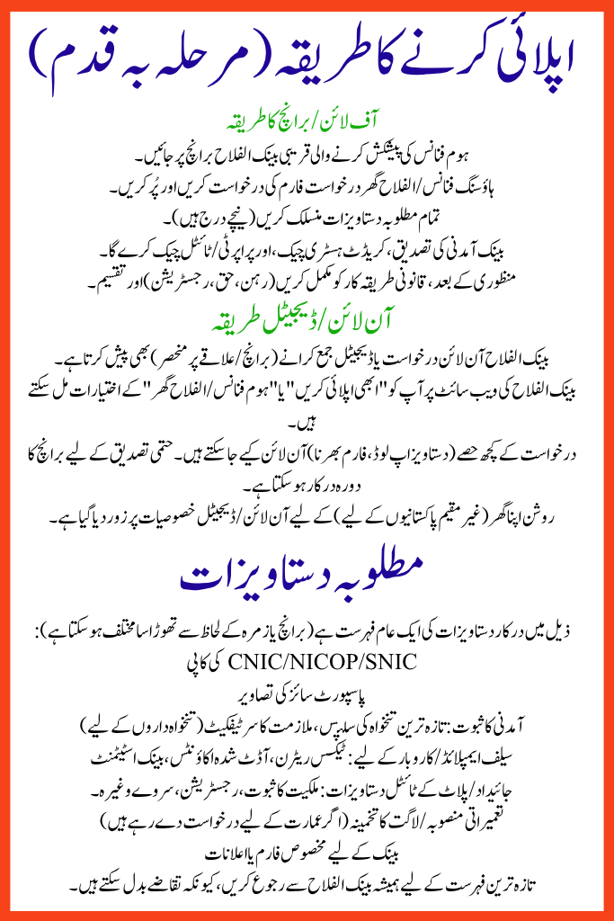 Bank Alfalah Ghar Finance Scheme also offers online application or digital submission (depending on branch / region).