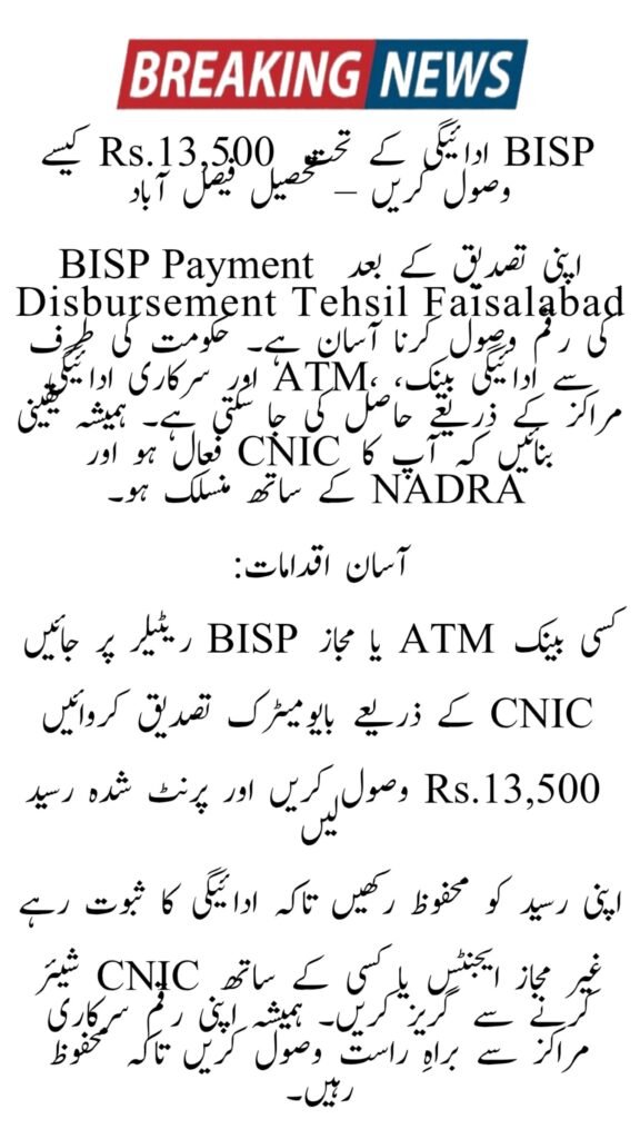 The BISP Payment Disbursement Tehsil Faisalabad 2025 program is an important step by the Government of Pakistan to support low-income families. Under this payment cycle, every eligible household will receive Rs.13,500 as financial help. The aim is to reduce the effects of inflation and support daily needs. The system now works with biometric verification and CNIC checks to make it transparent and safe. Families can easily collect payments through banks, ATMs, or authorized shops. In this article, you will learn how to check eligibility, verify your CNIC, and receive your BISP payment step by step.