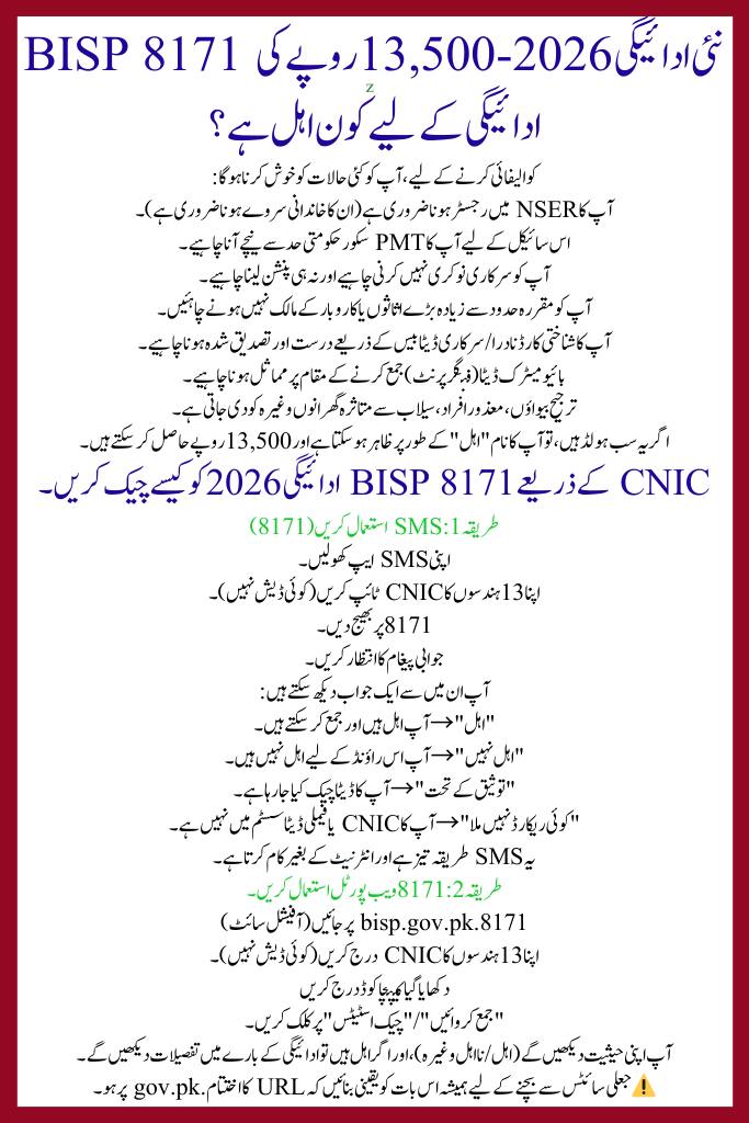 | BISP 8171 (April–June 2025) | 1 June 2025 | 30 June 2026 | Rs 13,500 | Via SMS 8171, via 8171 web portal, or BISP camps |