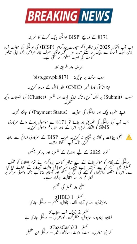 The Government of Pakistan has introduced the BISP 8171 Cluster Payment System under the Benazir Income Support Programme (BISP) for October 2025. This new digital method ensures that every eligible woman receives her Rs.13,500 installment safely, quickly, and transparently. By dividing all districts into organized clusters managed by trusted banks and mobile wallet partners, the government aims to reduce long queues, prevent fraud, and make the process more efficient. The cluster-based model is another major step toward empowering women and strengthening Pakistan’s welfare structure.