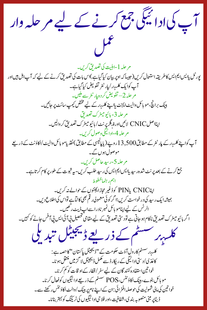- Digital disbursement: Funds are processed electronically; beneficiary verifies via CNIC and biometrics.