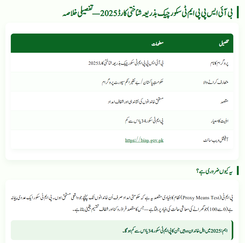 The score is based on data collected through the National Socio-Economic Registry (NSER). Factors like income, property, utility bills, children’s education, and employment are included. In 2025, only families with a PMT score of 34 or less will qualify for BISP assistance.