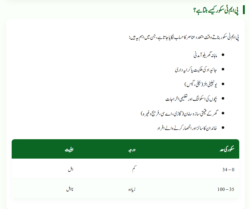 The main goal of this system is to ensure that financial aid reaches only those who genuinely need it. The PMT (Proxy Means Test) score shows the financial situation of a household. The score ranges from 0 to 100, and the lower your score, the higher your chances of being eligible for BISP.