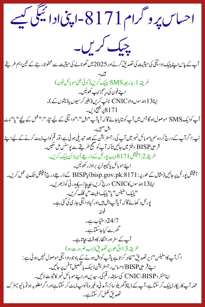 Via SMS (send your CNIC to 8171), the official web portal, or by visiting a BISP/Ehsaas office for in-person check.