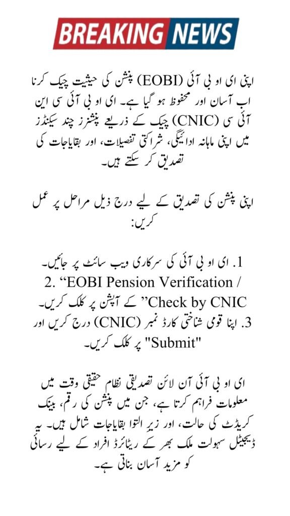 The EOBI online verification system displays real-time data including pension amount, bank credit status, and pending arrears. This digital service improves accessibility for retirees nationwide.