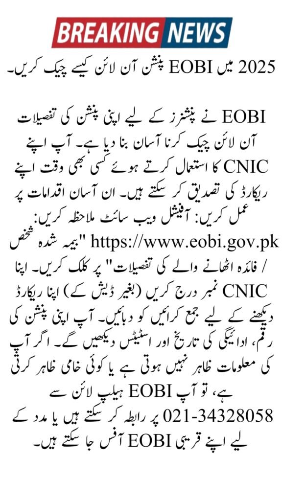 EOBI has made it easy for pensioners to check their pension details online. You can verify your record at any time using your CNIC.