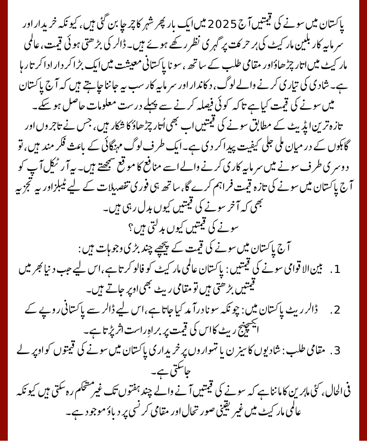 Gold prices in Pakistan today 2025 have once again become the talk of the town, as buyers and investors are closely watching every movement in the bullion market. With the rising dollar rate, global market fluctuations, and local demand, gold continues to play a major role in the Pakistani economy. People planning weddings, shopkeepers, and investors all want to know the gold price in Pakistan today before making any decision.