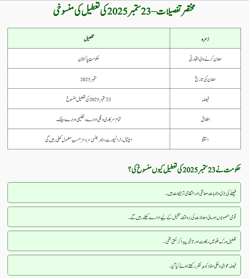 | Announced by | Govt of Pakistan Cancels 23 September Holiday |