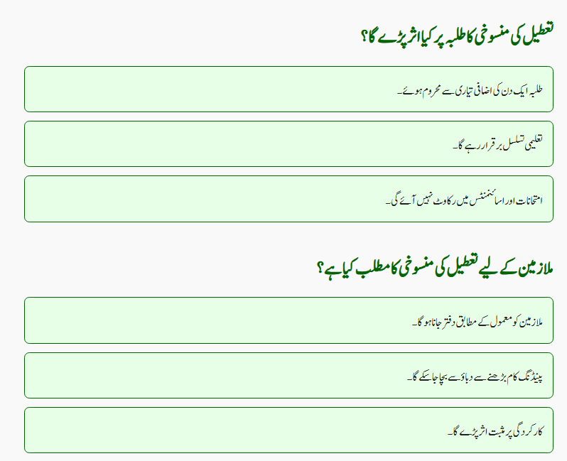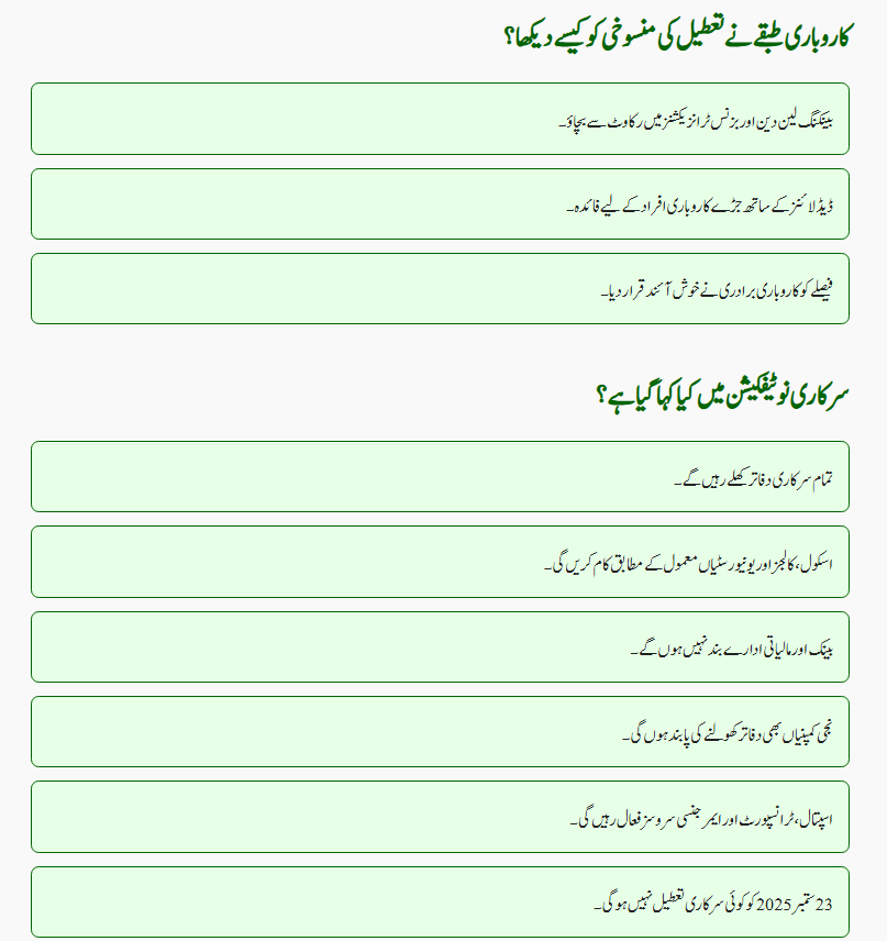 Hospitals, transport, and emergency services would remain open regardless, but since the holiday is canceled, all sectors will operate normally.Govt of Pakistan Cancels 23 September Holiday .