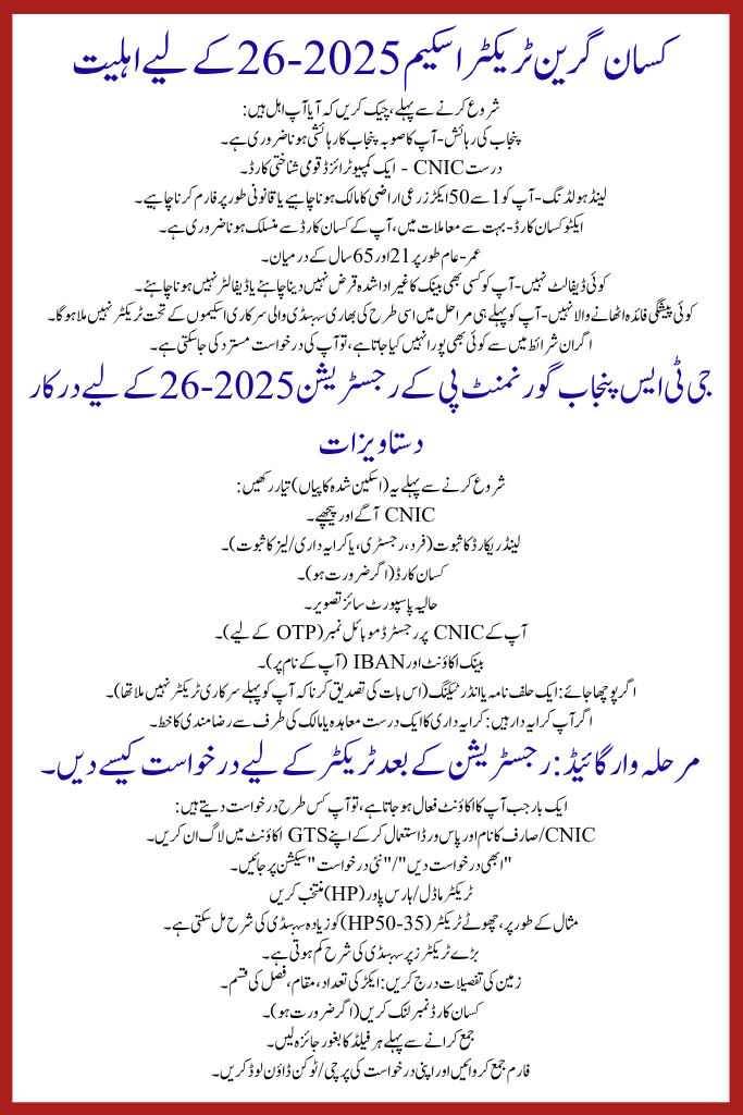 The GTS Punjab Gov PK Registration 2025-26 is your entry permit to the Kissan Green Tractor System Phase 2. By following the steps above — checking your eligibility, meeting documents, creating your account properly, smearing on time, and evading errors — you exploit your chance toward win a subsidized or even free tractor through the electronic canvassing.
