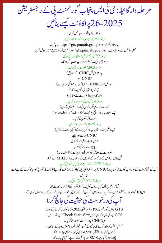 Quick Info Table for GTS Punjab Gov PK Registration 2025-26