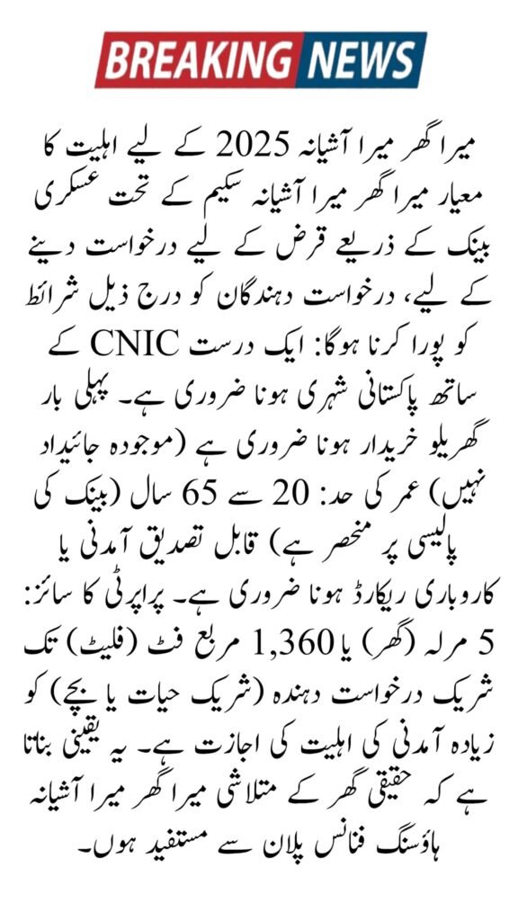 The Mera Ghar Mera Ashiana Scheme 2025 via Askari Bank is a great opportunity for low and middle-income citizens of Pakistan to become homeowners. With low markup, long repayment plans, and no hidden fees, the scheme promotes financial inclusion and housing growth across the country. Visit your nearest Askari Bank branch or check SBP official website for updated loan information and application forms.