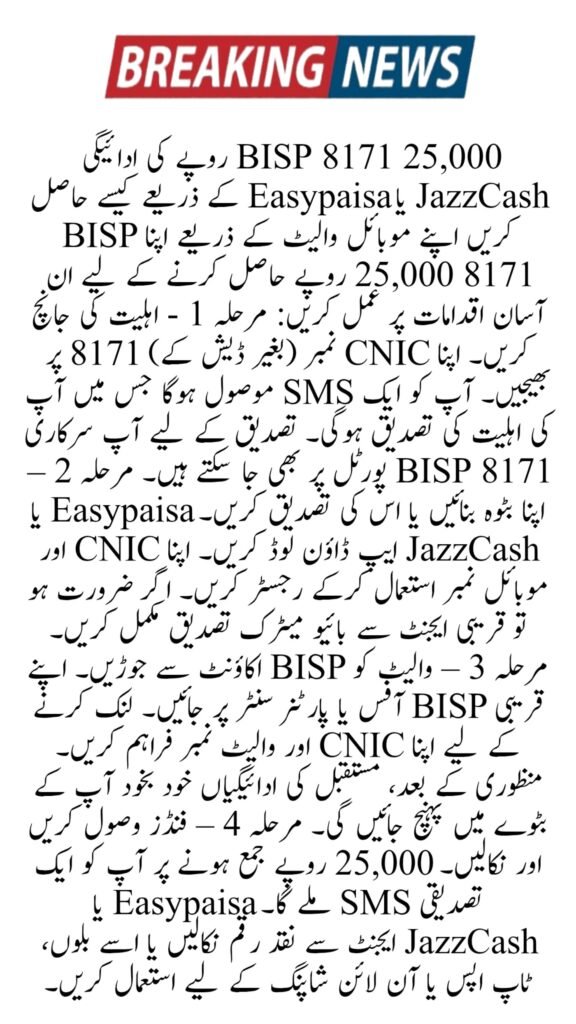 The BISP 8171 Mobile Payment 2025 is a revolutionary step by the Government of Pakistan. It ensures that every eligible family can receive Rs 25,000 directly into their JazzCash or Easypaisa account safely and quickly. By using the 8171 CNIC check service and linking your mobile wallet, you can enjoy a secure, transparent, and easy payment experience. This digital system gives power, respect, and independence to millions of Pakistani women and families.