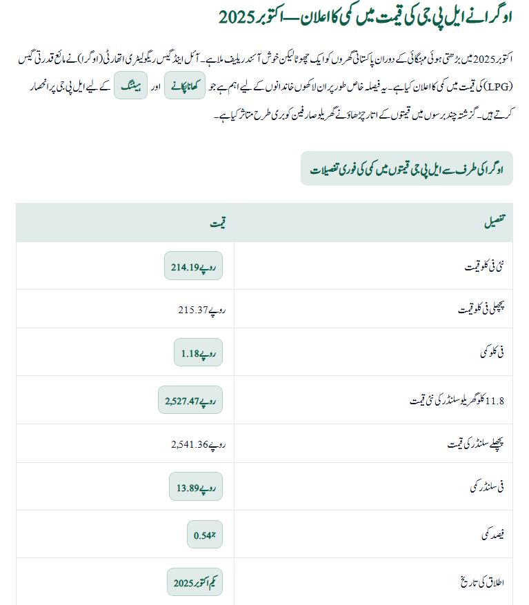 In October 2025, amid rising inflation, Pakistani households have received a small but welcome relief. The Oil and Gas Regulatory Authority (OGRA) has announced a reduction in the price of Liquefied Petroleum Gas (LPG). This decision is particularly significant for millions of families who depend on LPG for cooking and heating. Over the past few years, constant fluctuations in LPG prices have badly affected middle- and low-income households. Although the decrease may seem small, it offers some breathing space in monthly household budgets.