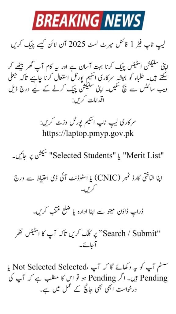 The Laptop Phase 1 Final Merit List 2025 is now available for students who applied under the Prime Minister Laptop Scheme. Thousands of students from universities, colleges, and technical institutes were waiting for this announcement. This final merit list confirms the names of selected students after provisional objections and corrections. More than 112,000 laptops are planned to be distributed in Punjab alone under this phase. Students can check their names online through the official portal. If selected, they must complete verification on time to receive laptops without delay. This scheme supports digital learning and education in Pakistan.