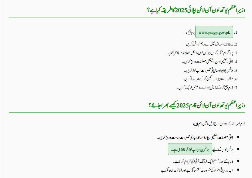 Filling out the Prime Minister Youth Loan Online Form 2025 is simple but accuracy is key. The form requires personal information (name, CNIC, address), educational background, and details about your skill or business. Applicants applying for business loans must upload a complete business plan.