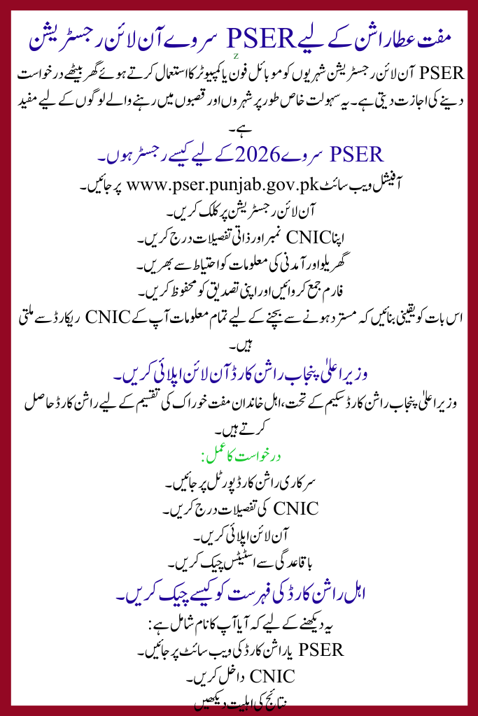 The Punjab Social and Economic Relief (PSER) Survey is a government initiative designed to collect updated data about households. This data helps the government decide who is eligible for welfare programs. In 2026, PSER registration is mandatory for families who want to benefit from Ramadan relief schemes.