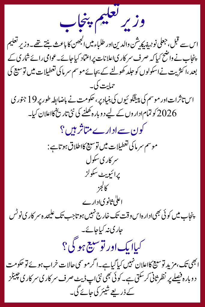 Originally, educational institutions were scheduled to reopen in mid-January. However, after reviewing weather conditions and public opinion, the government decided to extend winter holidays until 19 January 2026. This decision applies to all public and private schools, colleges, and higher education institutions in Punjab.