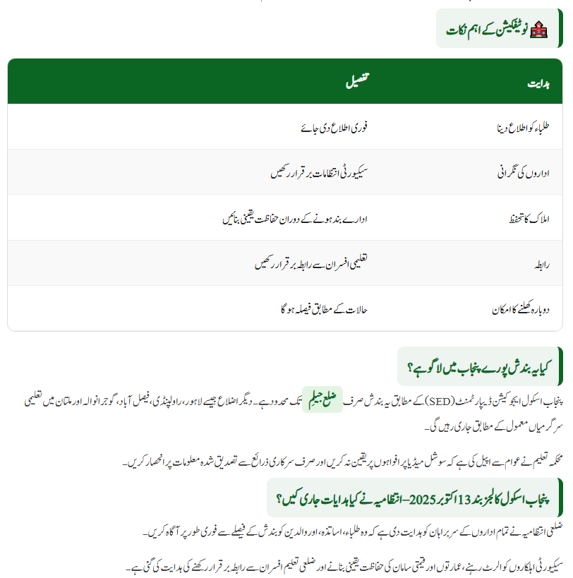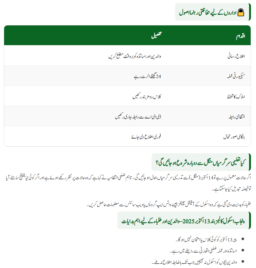 Educational activities in other districts — including Lahore, Rawalpindi, Faisalabad, Gujranwala, and Multan — will continue as usual. The government has urged parents and students not to believe unverified social media posts and to trust only official sources for accurate information.