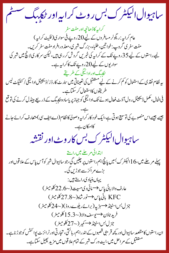 Below is a Sahiwal Electric Bus Route quick reference table summarizing the key facts: